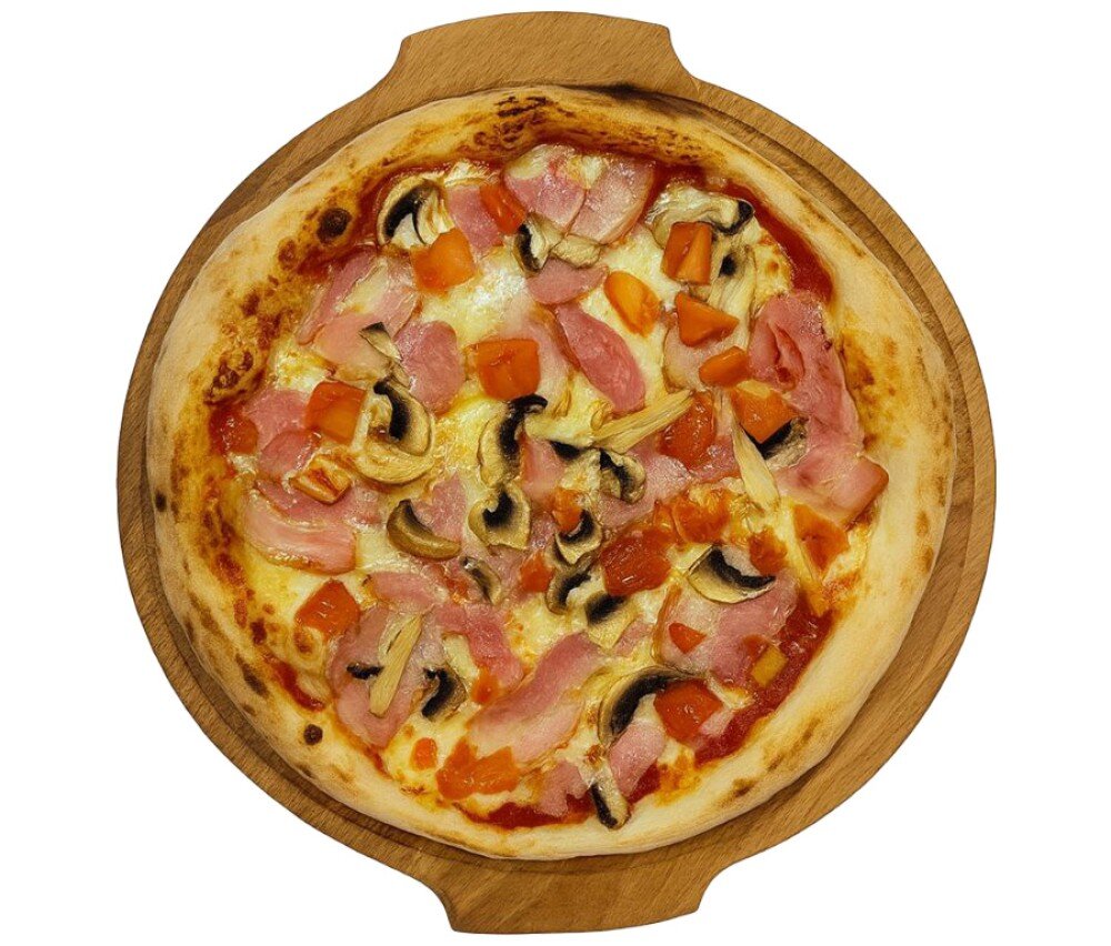 Соус Томатный, Сыр Моцарелла, Шампиньоны, Бекон, Ветчина, Лук, Помидоры 580г 32см/880г 41см