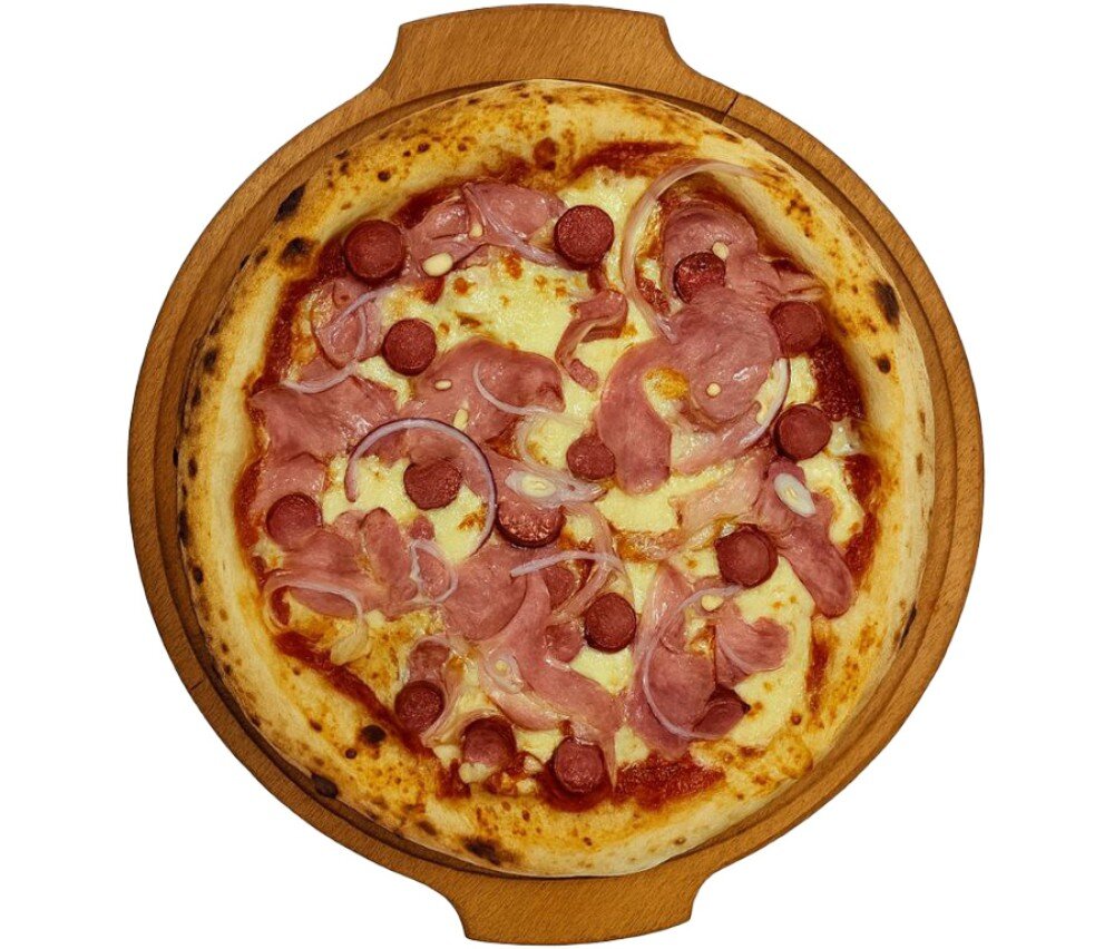 Соус томатный, Сыр Моцарелла, Колбаски баварские, Бекон, Ветчина, Лук, Чеснок 620г 32см/1080г 41см