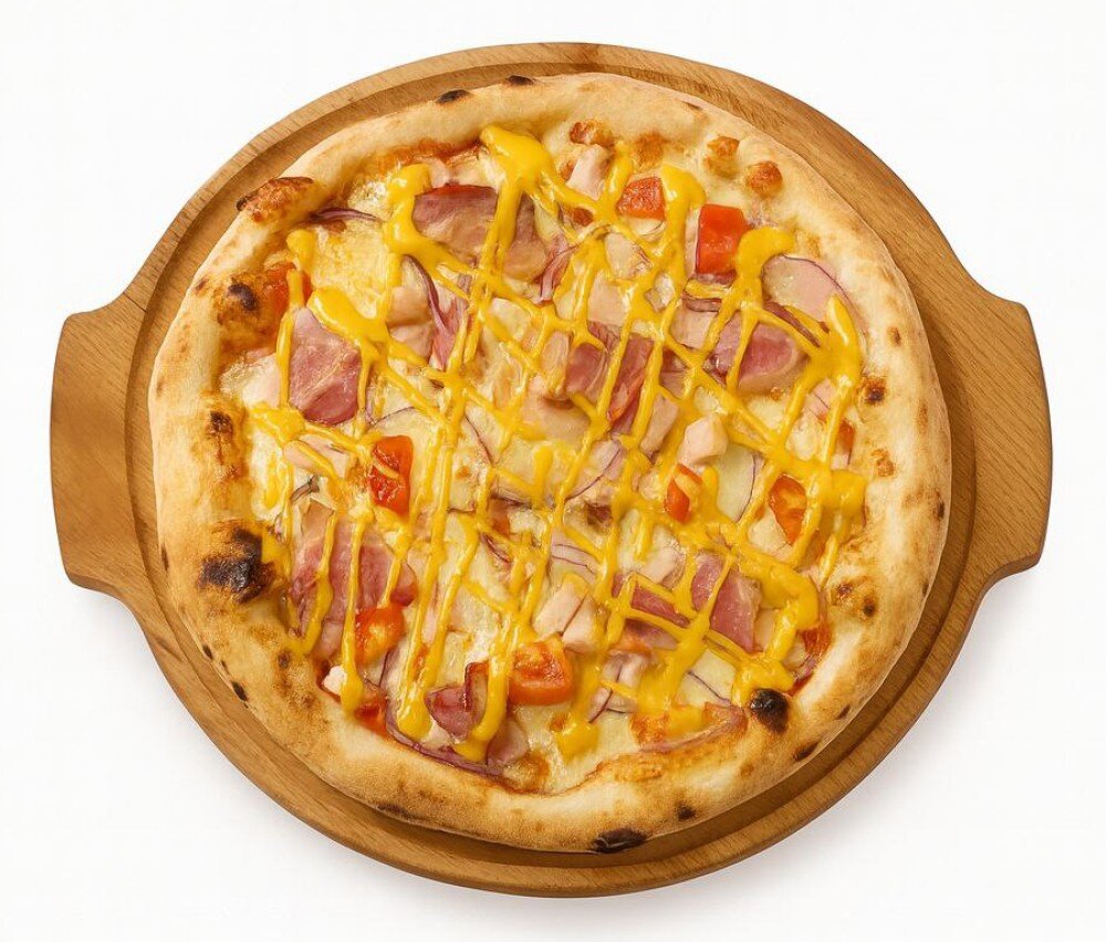 Соус томатный, сыр Моцарелла, копченая курица, бекон, лук, помидоры, соус горчично-медовый 620г 32см/950г 41см